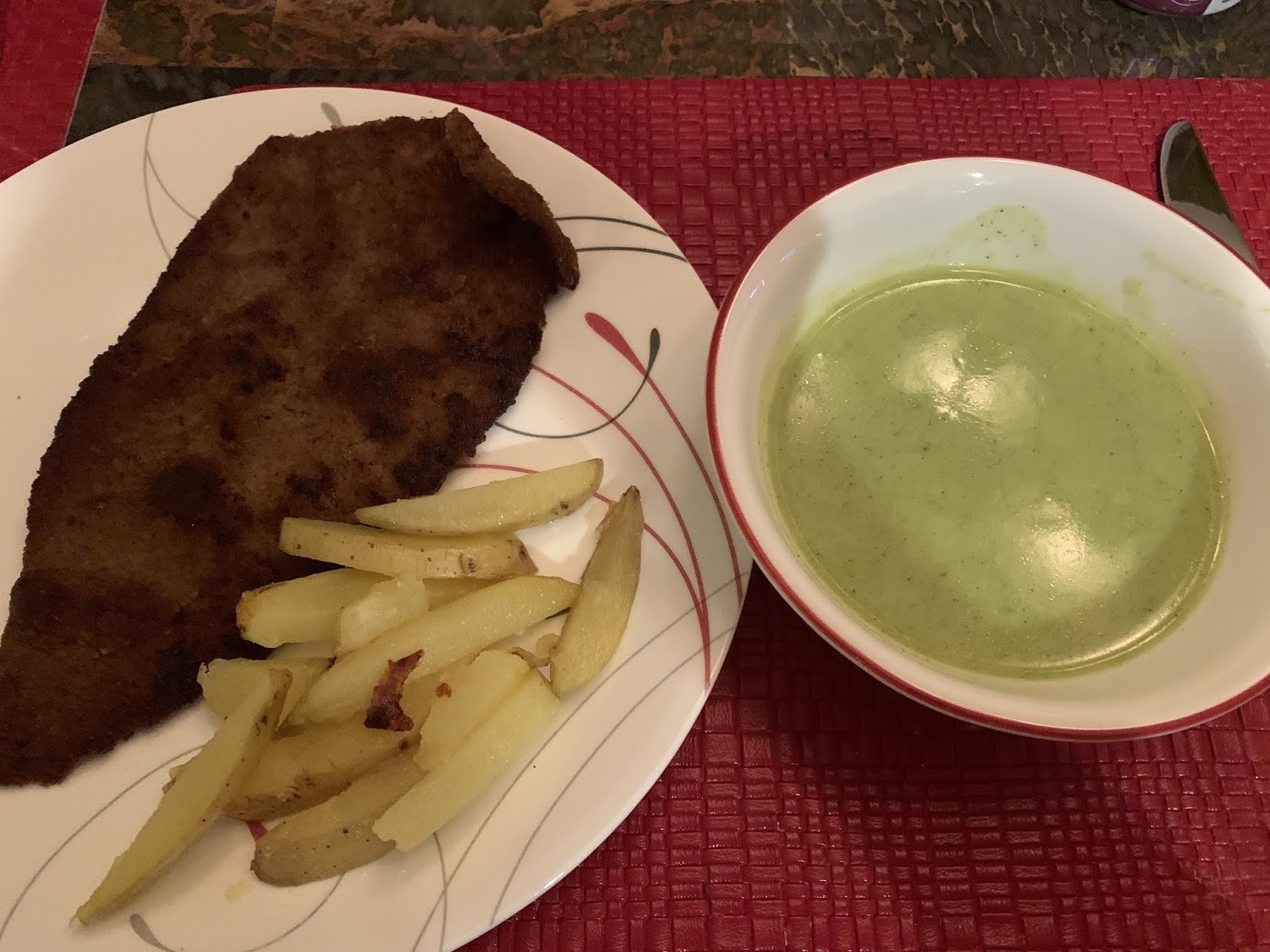 Steak milanesa with homemade fries and cream of zucchini soup
