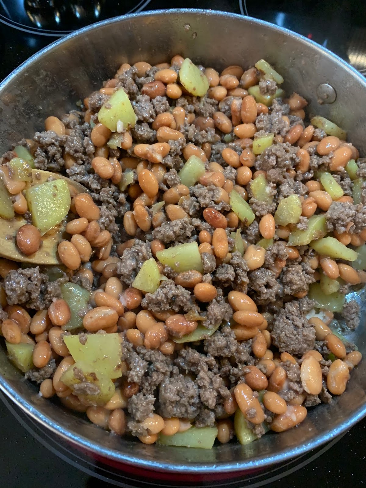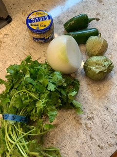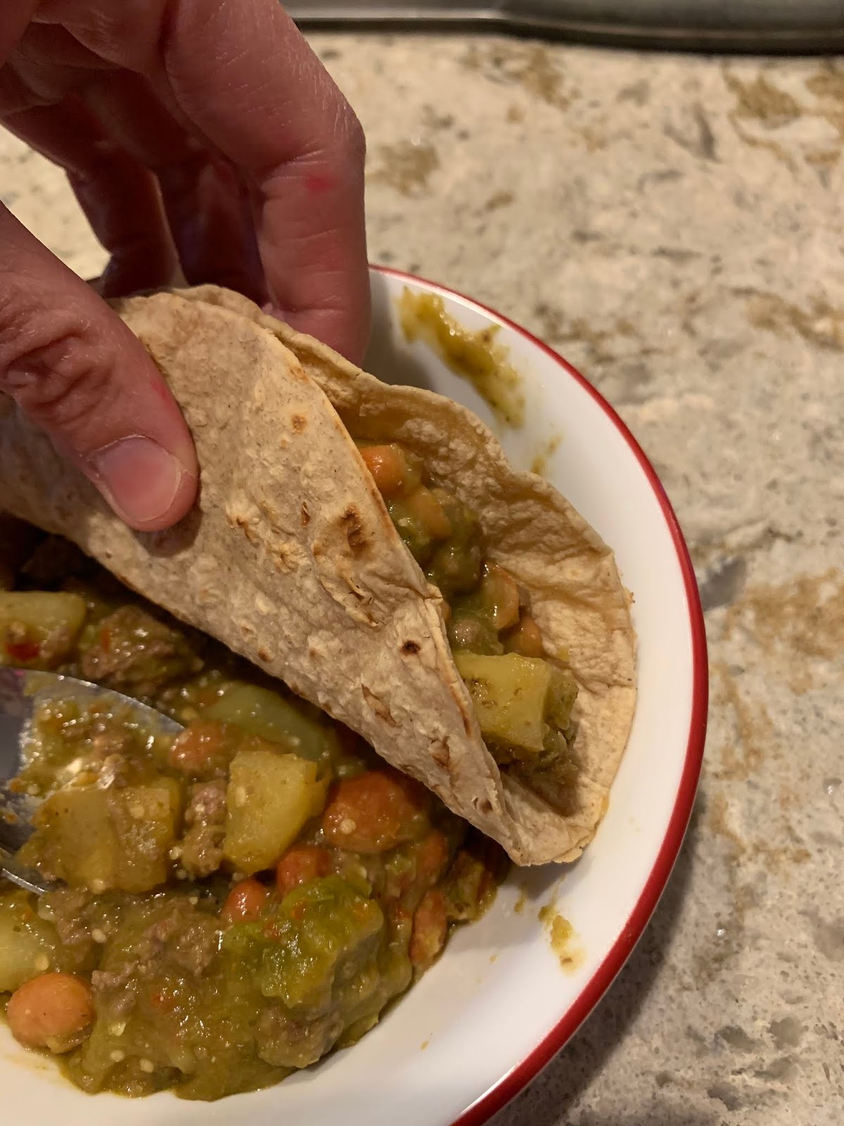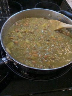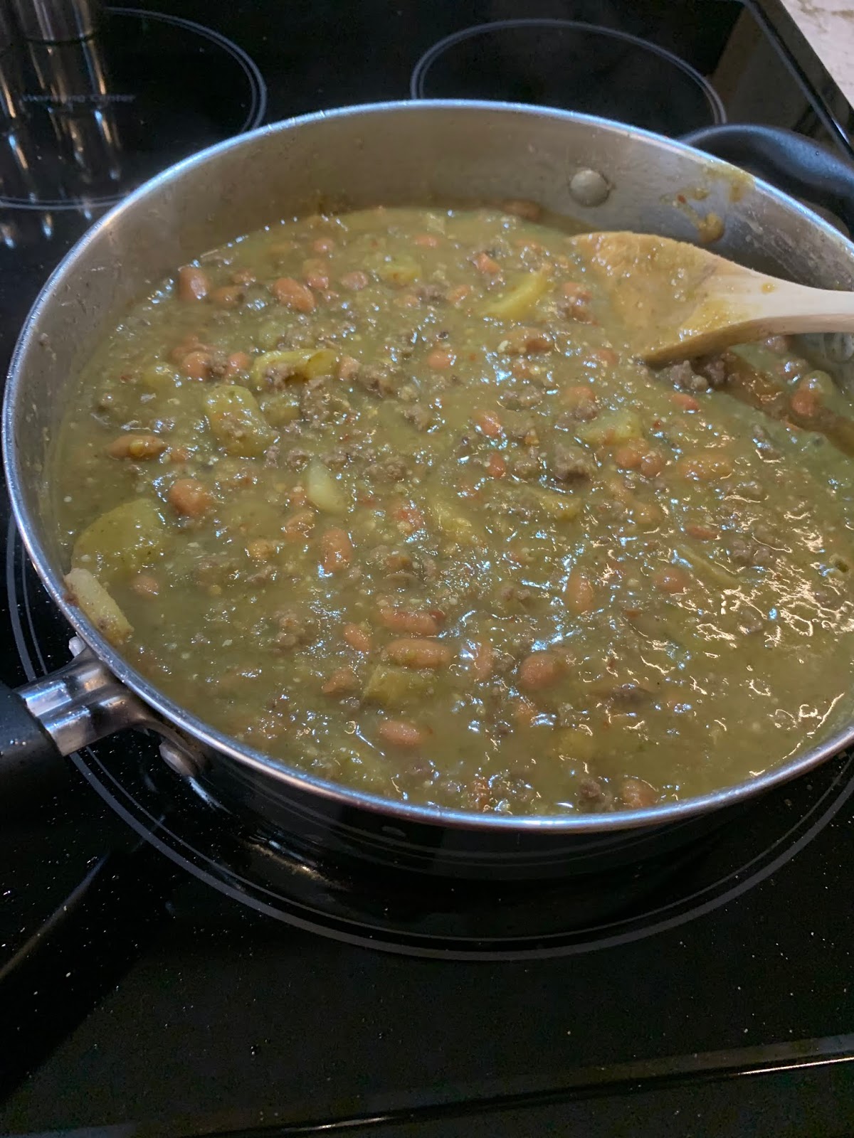 Up first earlier this week was what we call “carne molida en salsa verde”. To my knowledge this dish doesn’t have an official name. The translation is just ground beef in green (tomatillo) sauce. Basically it involves cooking up some ground beef, diced potatoes and pinto beans with some seasoning. Then, in a separate pan you boil some tomatillos, onion, several jalapenos (and I added a few dried arbol chiles). You then blend the above along with a little garlic and cilantro. Once you have the sauce, you pour it over the meat mixture, stir in some chicken bouillon and voila. Done. Really quite easy and SO DELICIOUS!! Also, SPICY!! (We are basically obsessed with spicy food. The spicier, the better). This is then eaten in a corn tortilla. Yummmm.