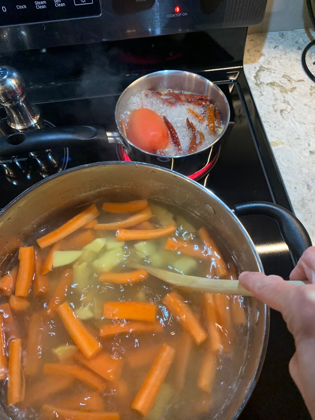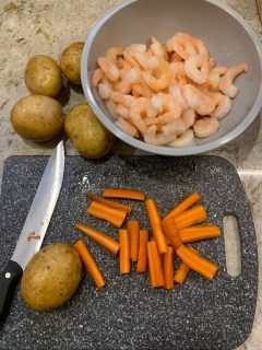 Then later in the week we had Caldo de Camaron, or Shrimp soup. This is a broth based soup which is very simple but delicious. There are many variations of this but I usually just put in carrots and potatoes and shrimp. In a small saucepan, boil a bunch of dried arbol chiles (the more, the spicier) with some onion and I usually put a tomato in too. You then blend it into a paste and strain it so you are only getting the liquid (and not any little chunks of the chile shell). Again, very simple. We simmer the shrimp, potato and carrot in water and add chicken and shrimp bouillon to it to taste, but you could do this in homemade chicken broth too if you wanted. We just never have that on hand. We separate out a bunch of the plain shrimp soup for the kids before then adding the spicy chile liquid into the broth. Garnish with some cilantro, squeeze fresh lime juice over it and done! Yum yum.