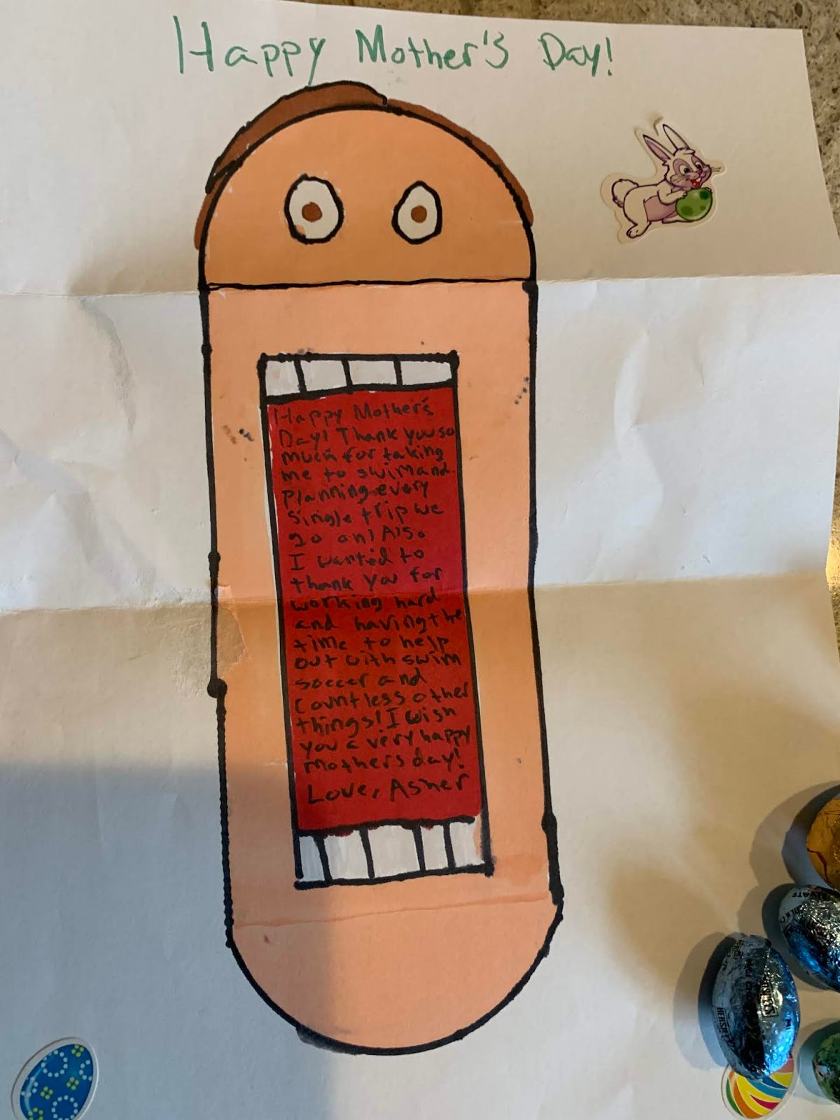 Happy Mother’s Day! Thank you for taking me to swim and planning every single trip we go on. Also, I wanted to thank you for working hard and having the time to help out with swim, soccer and countless other things! I wish you a very happy Mother’s Day! Love, Asher |