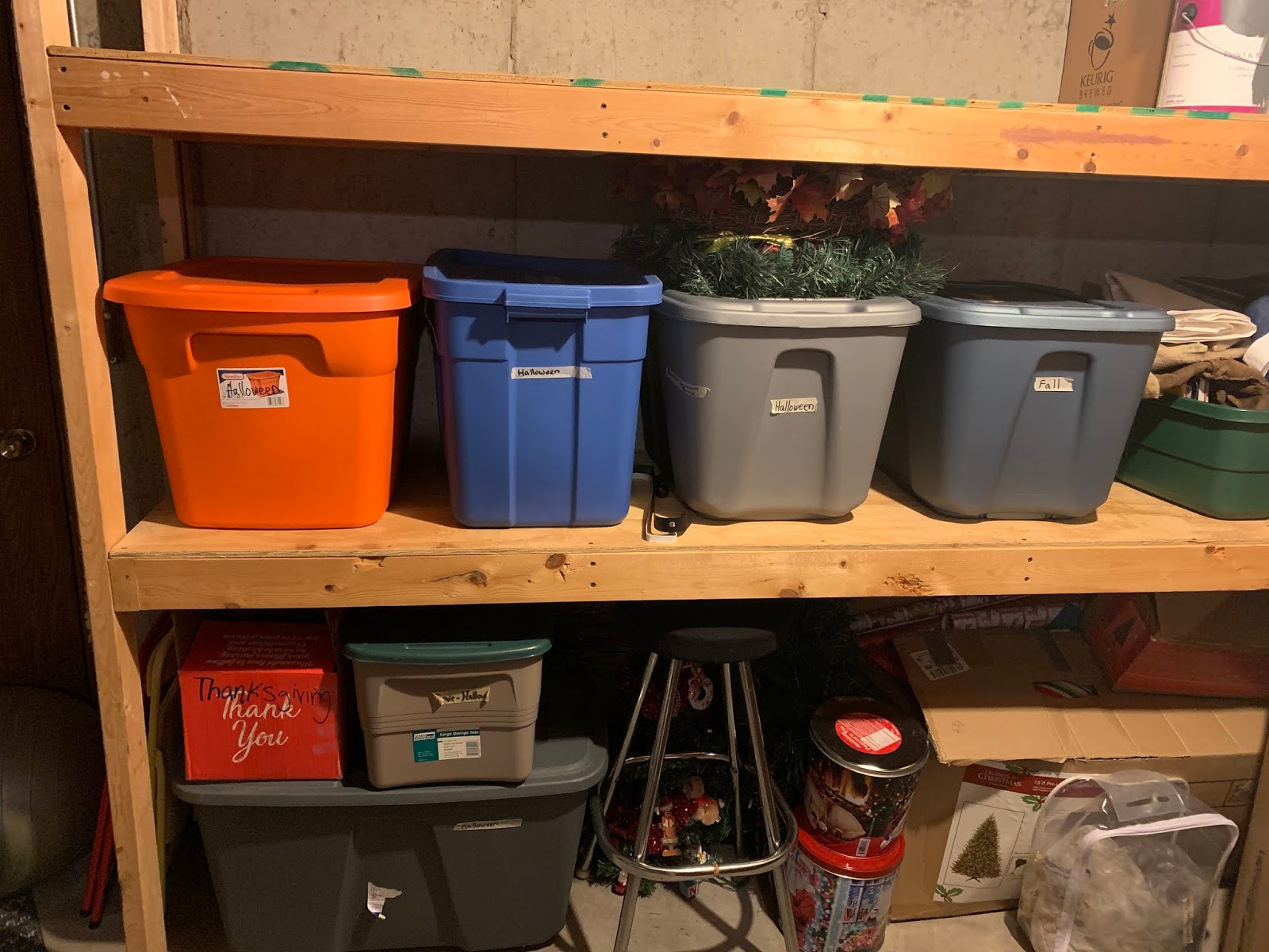 | I went through all of these boxes of Halloween and Fall decorations and threw a bunch of stuff away, organized and condensed them…Feels so good! Some day maybe I will buy all orange boxes for the Halloween stuff, red and green for Christmas….that would look so nice. Maybe someday. For now, these are perfectly fine. 🙂 |