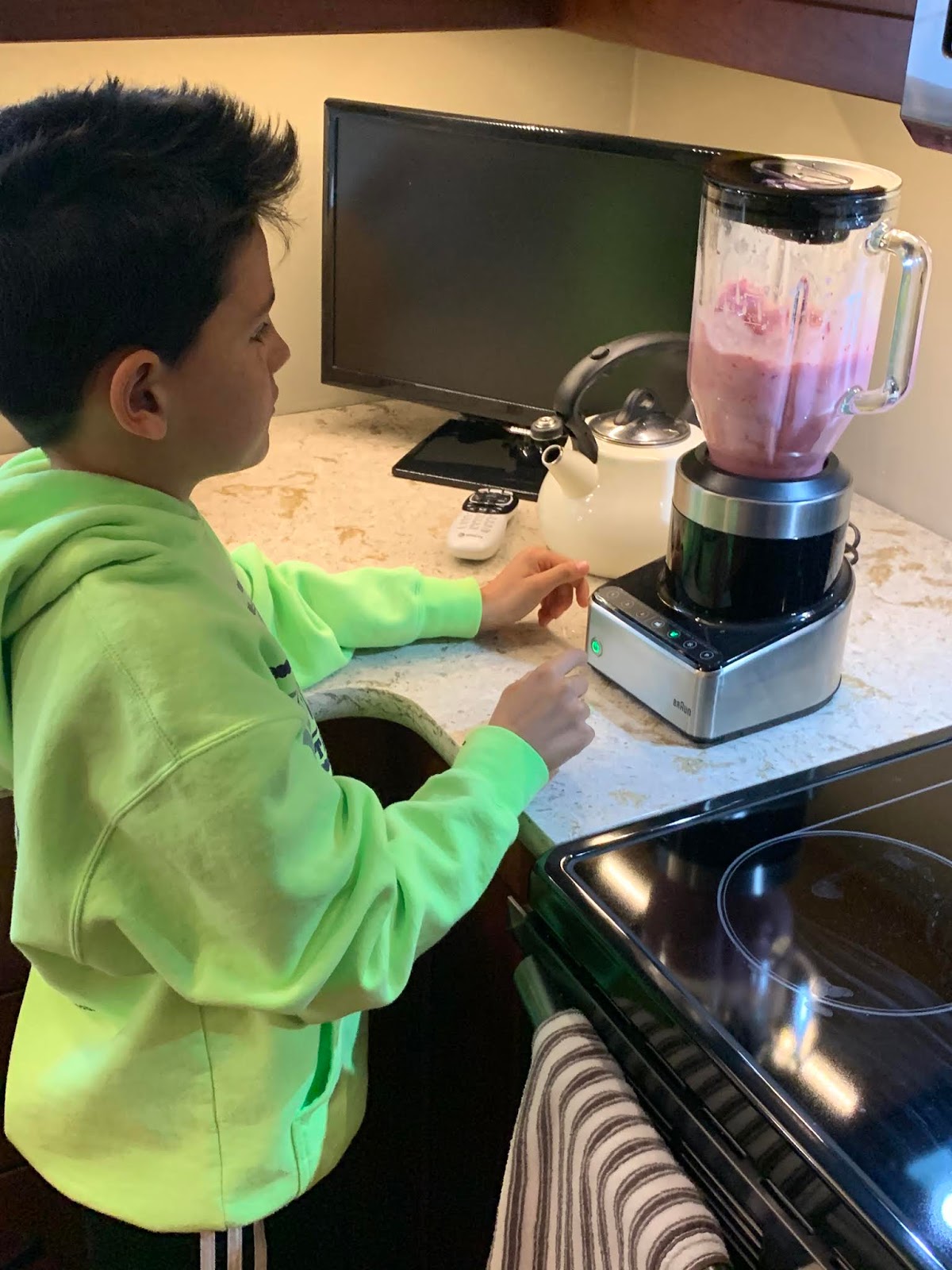 | Trying to get his vitamins in….he has been super into making frozen berry smoothies every morning! |