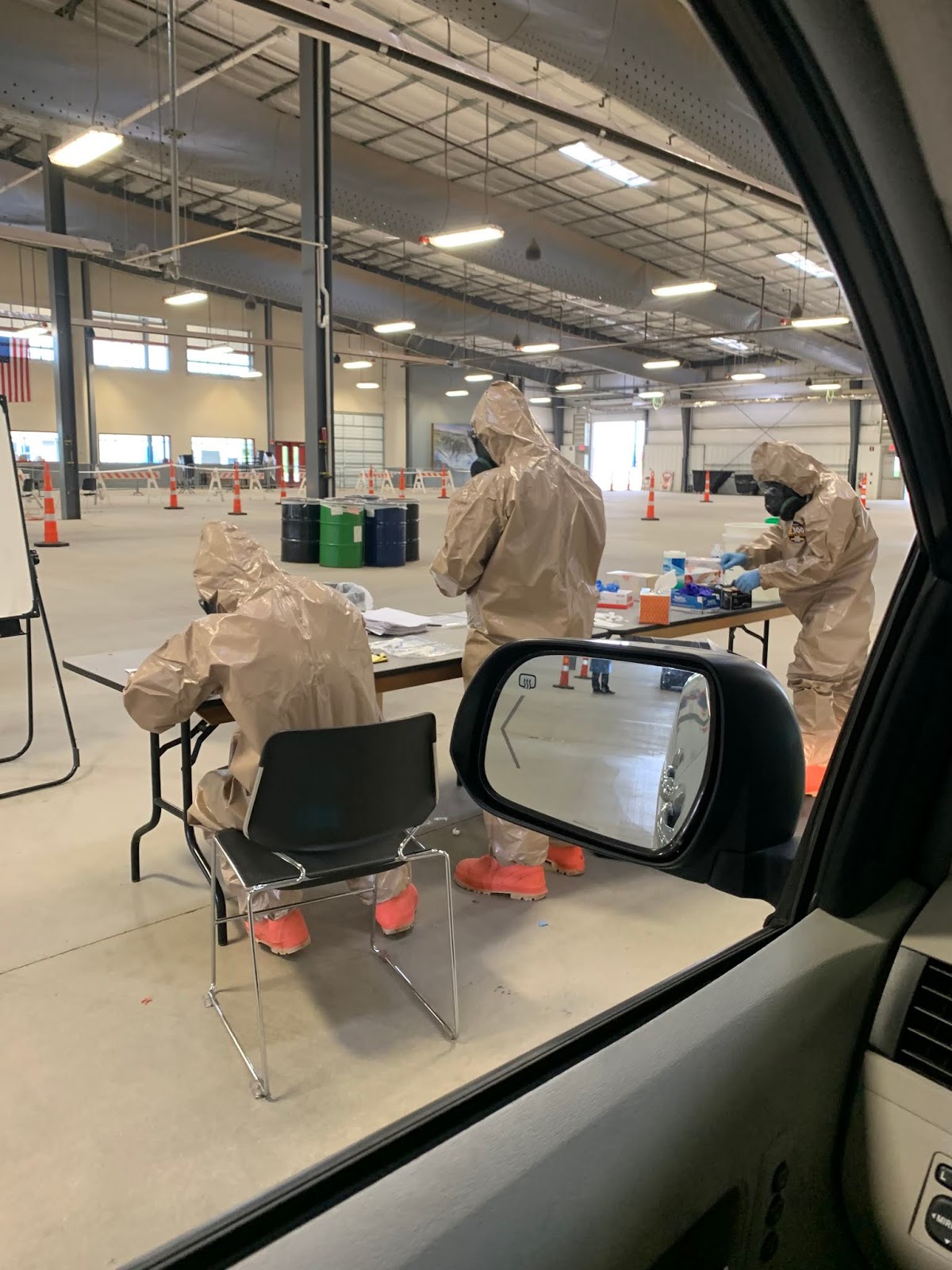 A minute later, we pulled forward to the interesting part. There were 3 guys at a table in full body hazmat suits and those big gas mask type masks waiting to do our tests.