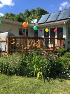 | This is around the side of our garage. I don’t even know what the purple things are, but they are very beautiful! I cut it down to the ground every fall and it grows back up like this every year. |