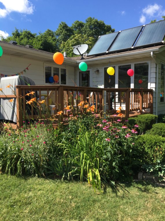 In the backyard, I generally buy some annuals for 3 planters on our deck, one for our concrete patio and some for small planters and in the bed back by our shed. I can see this area from the kitchen window, so I try to pick some fun, bright colors.