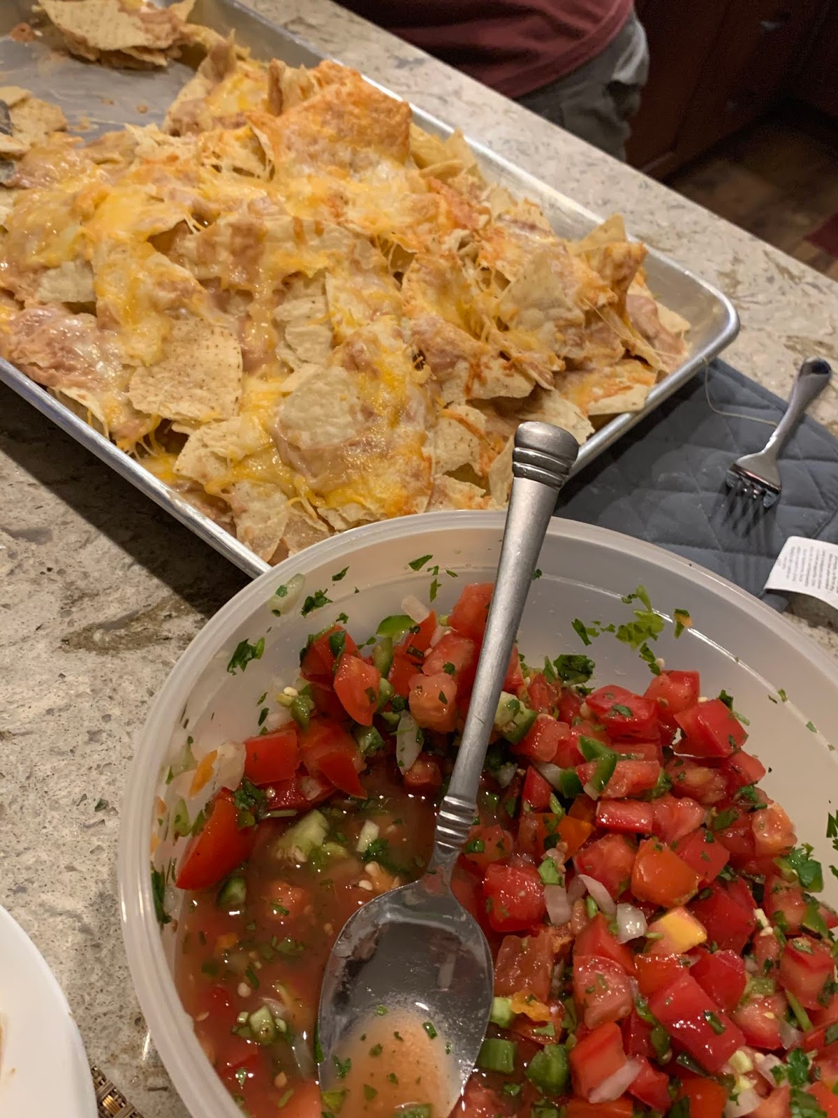Nachos! I am grateful that somebody, somewhere once decided it would be a good idea to smother tortilla chips with refried beans, cheese and in our case, the most delicious pico de gallo. (There are many varieties- this is just our favorite). I LOVE nachos and am grateful for them during every bite, every time I eat them. 🙂