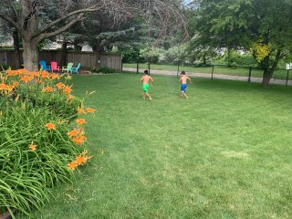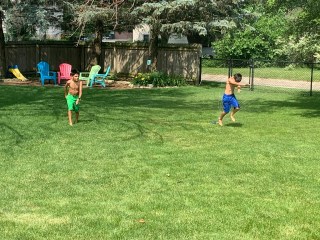 I needed a regular old sprinkler anyway for watering a newly seeded area in our front lawn, and fortunately we were able to find one of those. I told them I think all I ever had was a regular sprinkler to run through as a kid and that I never saw anything wrong with it…. Isn’t the point to cool off??? They had a good time although maybe the fun wasn’t quite as long lived as if they’d had the slip n’slide.
