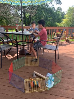 I think I mentioned already this week that we are having some HOT weather around here. It feels like summer for sure!! Yesterday I sat out on the deck early in the morning and made up that new habit tracker I shared yesterday and it was gorgeous, but by the time Ivan and I went for a walk around 7:30 a.m., it was already heating up! The boys and I had breakfast on the deck too before it got too hot. The deck boards in the shade were still cool, so they took turns bringing the hamster friends out to play while they ate. 😊 Always entertaining to watch the little guys.