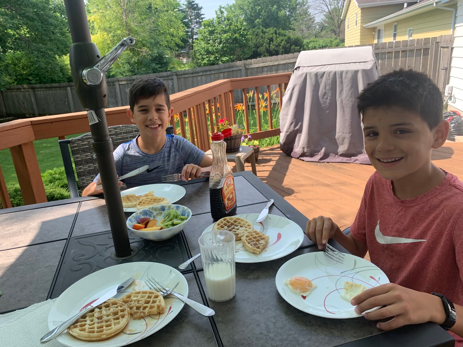 | Waffles and fruit outside! |