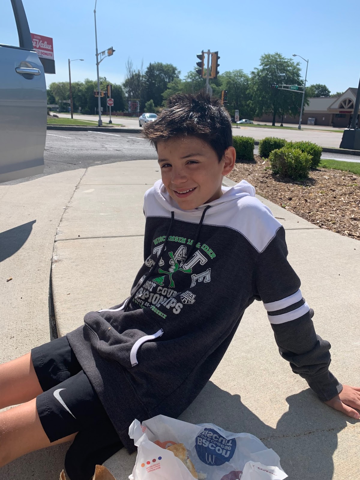 A post-morning swim, outdoor-on-the-curb breakfast date at McDonald’s yesterday with Asher. He LOVES their chicken biscuits!!