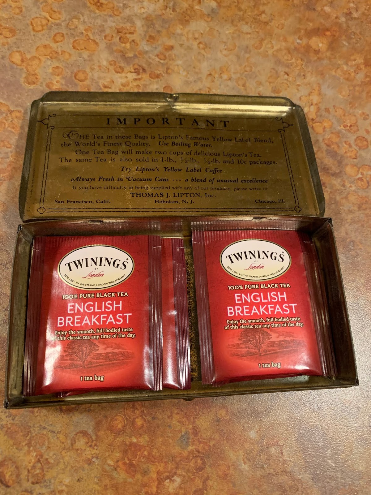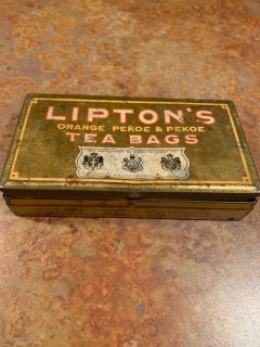 I also think of our trip and the antique shops every morning now, because my Mom picked up this antique tea tin from one of the shops and gave it to me for Christmas (since I drink tea every morning). I keep it stocked with tea bags downstairs behind our bar, which is where I make my morning tea while everyone else is sleeping.