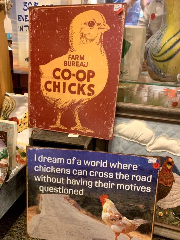 One favorite find from a shop there that just cracked me up (the bottom sign, about the chicken crossing the road!):