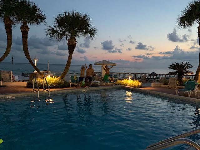 7:00-11:00 range: Figure out dinner and evening plans. Some nights we ate in (we got steamed peel and eat shrimp one night, got pizza another night, one time we just had appetizers for dinner, etc.), which meant swimming after dark in the pool for the boys and adults having drinks/ hanging out on the deck until late. Other nights we went out. One night we went out on the fishing pier and watched a guy catch a shark(!), another night we went out a little earlier for a really nice seafood dinner, one night we ended up at the Pier Park area and rode the Sky Wheel/ kids did a trampoline jump thing, etc.