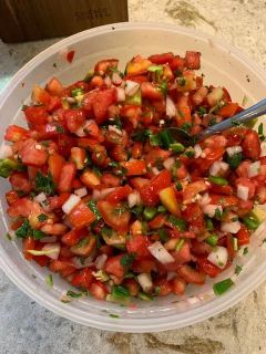 -spent a long time cleaning out the fridge/ putting groceries away, chopping fruit/ melon for the week and made a big batch of pico de gallo with a bunch of tomatoes and jalapenos from my garden!