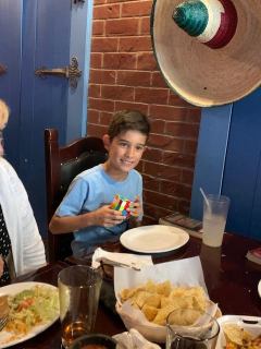 | Out to lunch yesterday…Ethan was inspired by the film to pull one of his speed cubes back out! Pictured here at the table with his 3×3 cube. 🙂 |