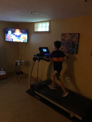 Lunch break. Was raining all day so I told them to MOVE somehow. Walking barefoot on the treadmill was Asher’s choice, I guess. 🙂