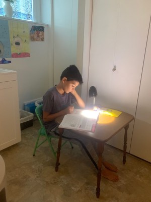 Asher decided to join me at this little, old table in my laundry room/ office for a little while so he could be nearby in case he had questions about something: