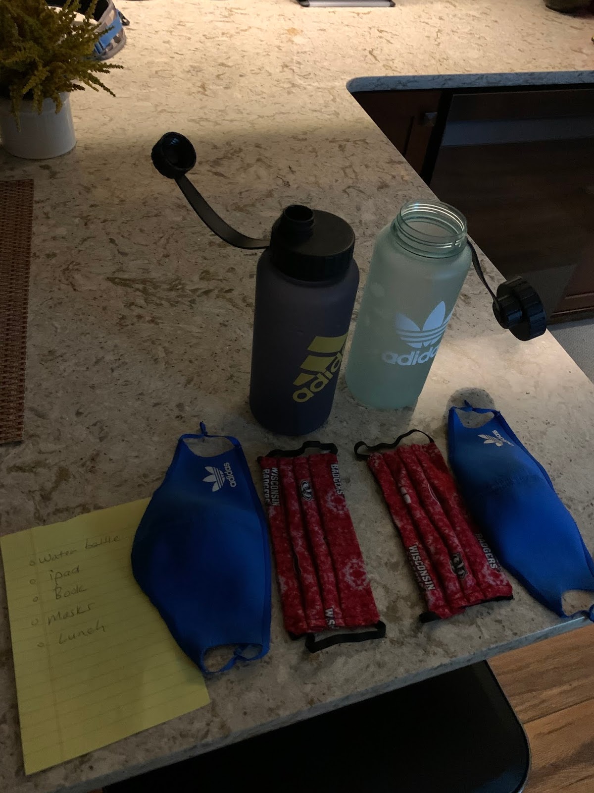 Lunches in the fridge, masks (plus extras) and water bottles ready to go! (no water fountains this year, of course, so they need to make sure to remember their water bottles everyday.)