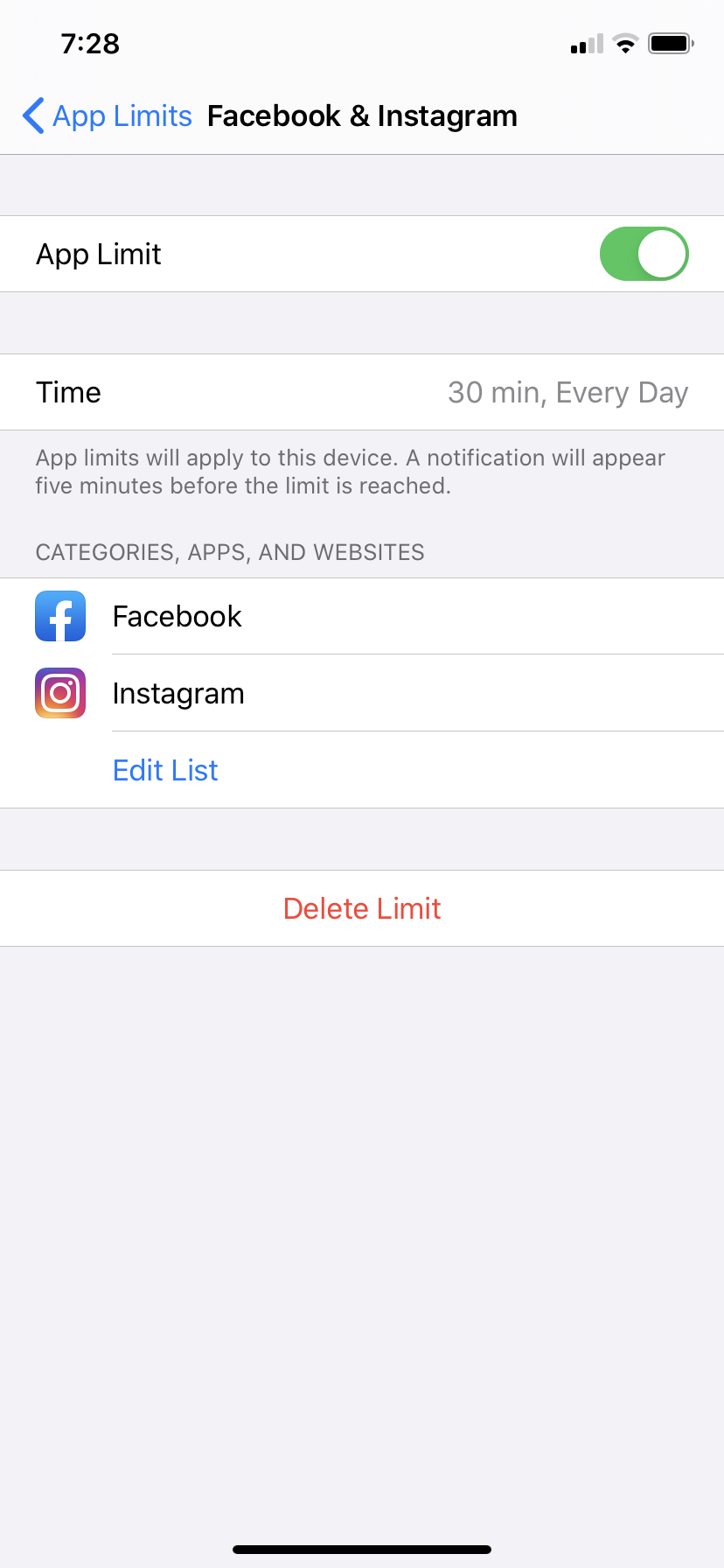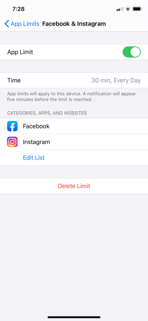 I’ve been using the 40 minute total limit for several weeks now, and many days it has still been feeling like too much. I will check in multiple times a day on one account or another, and actually find myself thinking, “Jeez, I still have time left??” I took that as a sign that I was ready to cut back a little more, so I lowered the limit to 30 minutes.