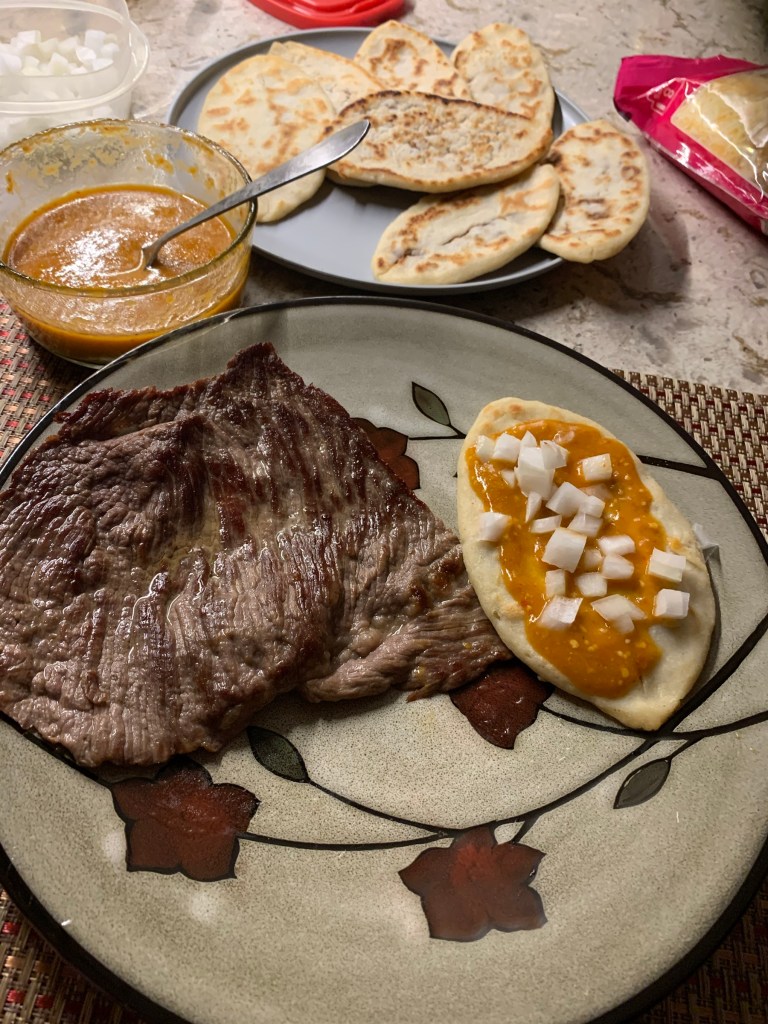 4. TLACOYOS: My sister-in-law dropped off a batch of tlacoyos the other day- one of our favorite Mexican foods. A tlacoyo is made of masa into a soft, thick dough-like substance, then shaped into an oval, with a thin layer of refried beans inside. You then top them with the most delicious (and SPICY) salsa, onions and crumbled cotija cheese, and eat this scrumptious thin cut Mexican steak with it. AMAZING. Just AMAZING. So good. She makes these for us almost every month and we are eternally grateful. 🙂
