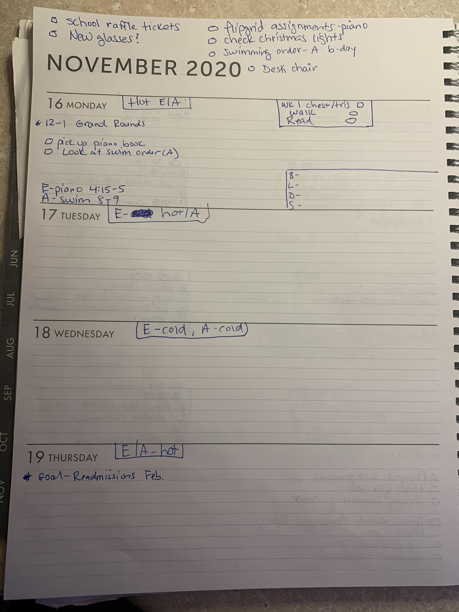 It stays with me, at my desk or in my purse, at all times. I look at it everyday and update it constantly. This is what I reference when making other plans/ “checking our schedule”.