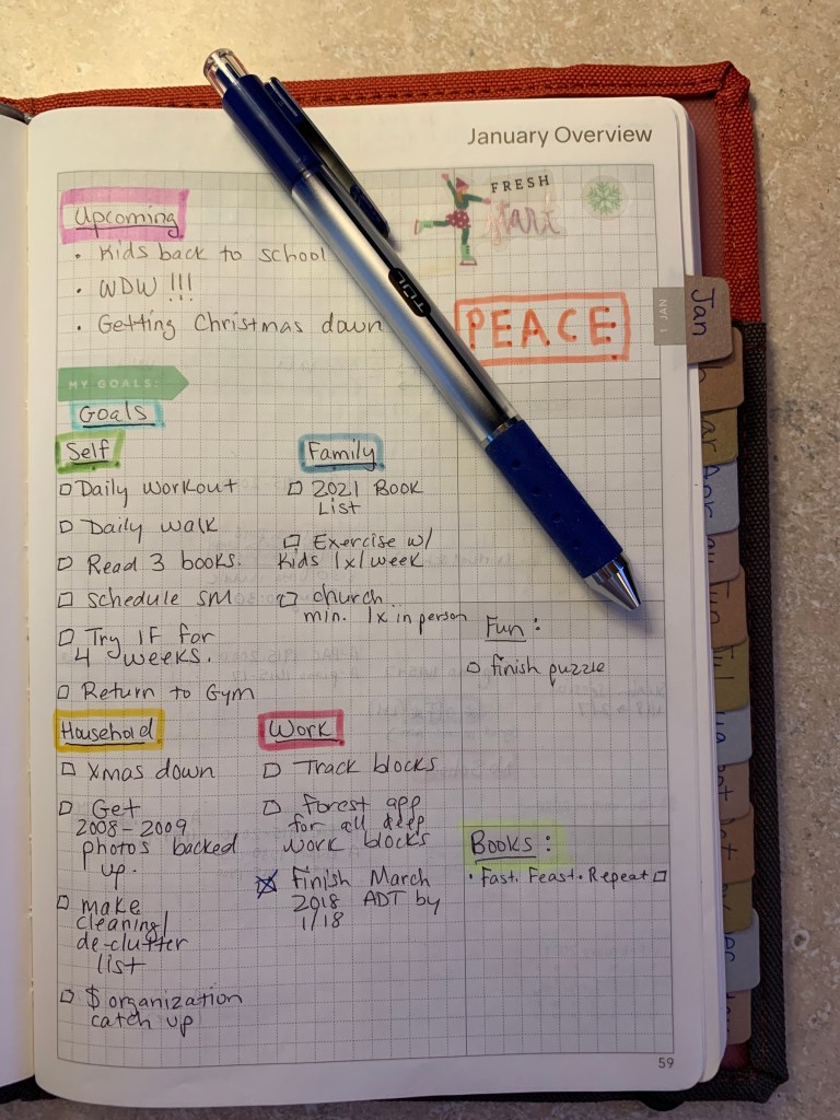 Yesterday I updated a few pages in my planner. I finally did the December Review page, and I also decided how I want to use the Quarterly pages. I decided I think I don’t want to make separate quarterly goals this year. It didn’t flow that naturally for me last year, and I think I’m good with just my 21 for 2021 list plus my monthly goals.