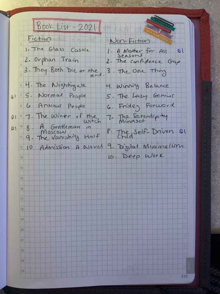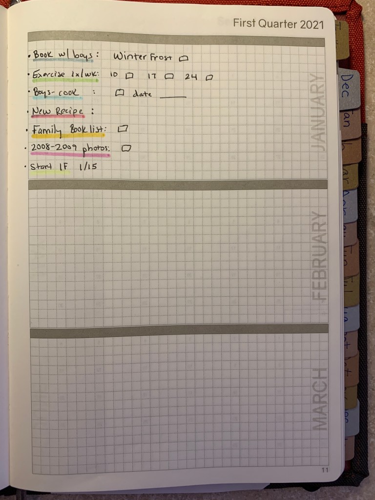 Instead, I decided to use the quarterly page as sort of a working page for ongoing 21 for 2021 items. Several items on my list are repeating “to dos”, like reading a book per month with the boys, exercising with them once per week, making one new recipe per month. I view these items as separate from my personal daily habit tracking items, so I liked the idea of having a separate little place for them. I don’t feel “chained” to my 21 for 2021 list, either, and if something doesn’t happen, it’s okay.
