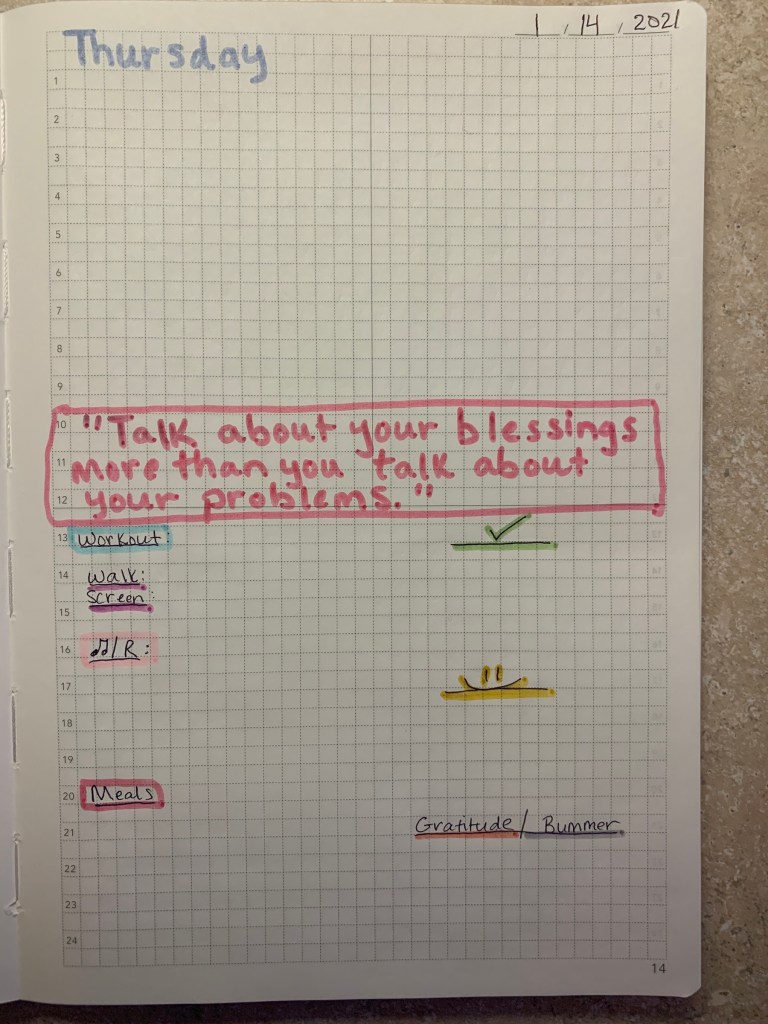 The only change I’ve made recently is making my “Gratitude” section a “Gratitude/ Bummer” section. Sounds sad, but sometimes there IS a bummer or something bad that happened that I want to record. I’ve been color coding them- a pink dot means it’s a gratitude item, a grey dot means it’s a bummer item. I always list GRATITUDE picks FIRST and try to limit it to only one bummer. 🙂