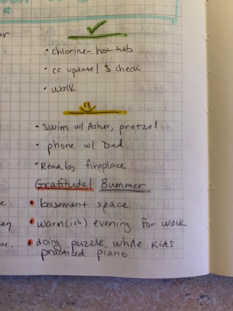 I’m very happy with this little part of my daily journaling routine. Honestly, if you don’t have a journal of any kind, I would highly recommend just trying this section only for a week! I’ve mentioned this before, but the GREEN CHECK= things I got done that day, the SMILEY= things that made me happy/ pleasant things and the GRATITUDE/BUMMER is a place to list what I’m grateful for that day (or disappointed about).