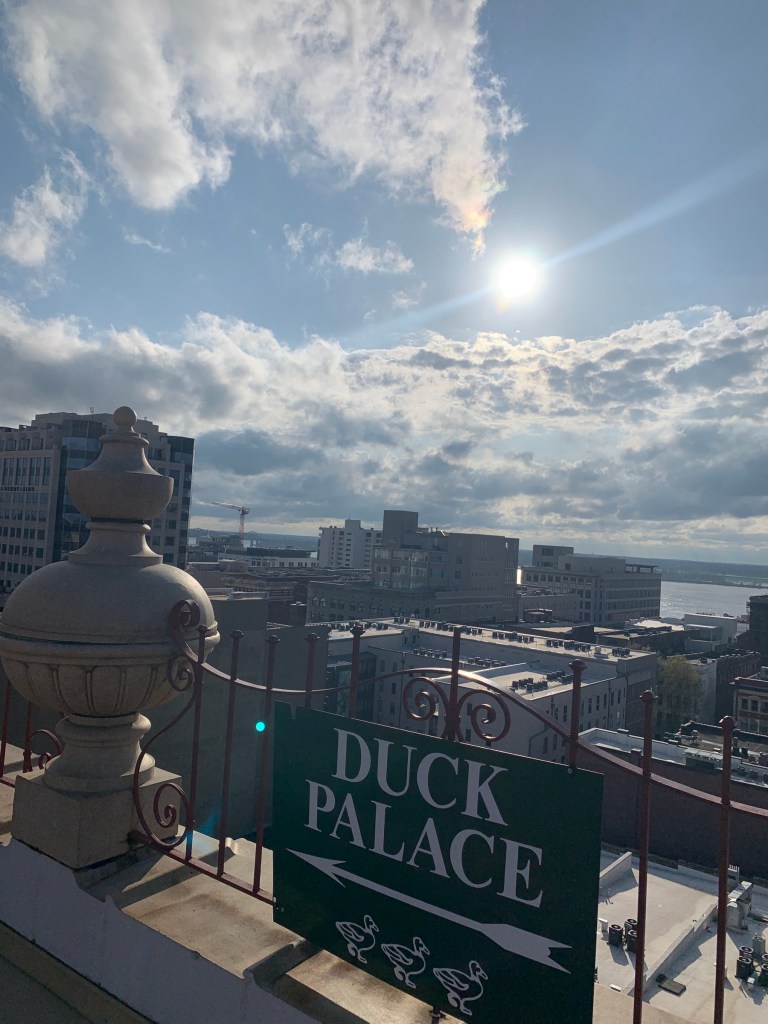 After the duck ceremony, we checked out the rest of the hotel (they have a little “memorabilia room” on the 2nd floor with history of the hotel and its roots in Memphis). Finally, we took the elevator up to the rooftop to see the “Duck Palace” (enclosure where the ducks sleep at night) and views of Memphis from the roof!