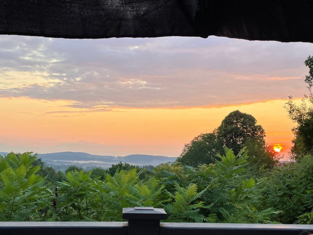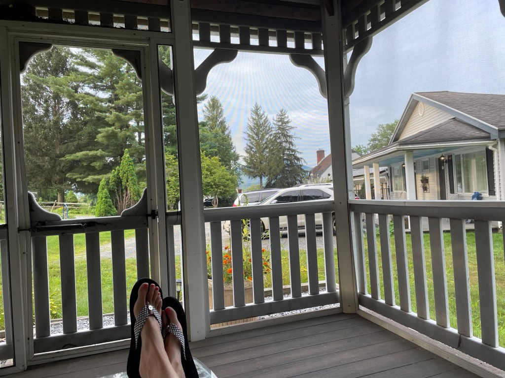 * Current view this morning from a screen porch gazebo at our inn: