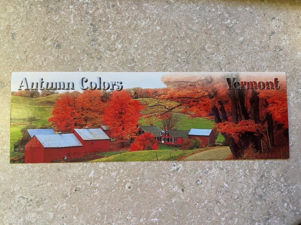 I bought this little bookmark on our trip recently, even though the trees definitely did not look like that in August. I’ve always dreamed of being in New England in the fall, though, so I grabbed this bookmark. Fall travel is tricky with school aged kids, so using a fall Vermont bookmark while I read this fall will have to suffice. 🙂