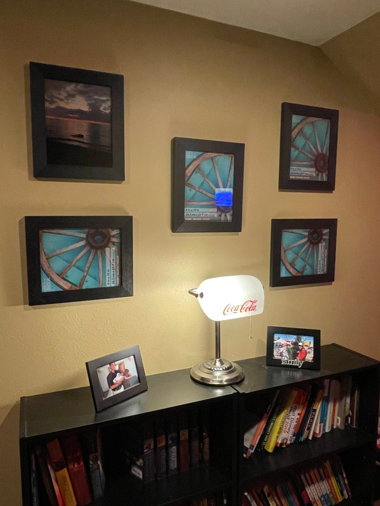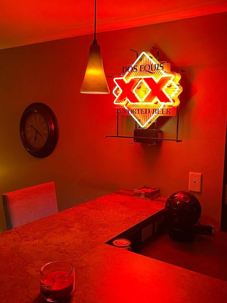 We had to wrap/ finalize a gift for Ethan’s friend’s birthday party and get him off to that. The neighbor girl got dropped off/ talked with the parents a little bit. My parents were getting ready to head home. I made a grocery list and Ivan went to get groceries. We finally hung our new beer sign in the basement, and hung picture frames up on this one wall in our rec room.