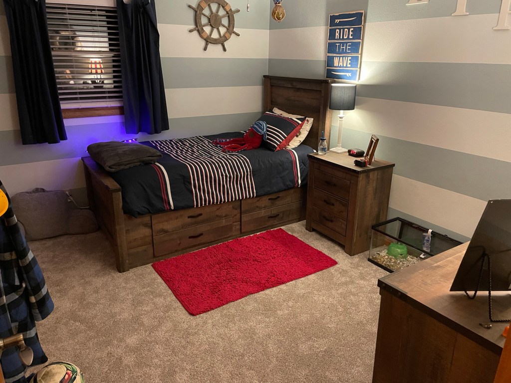 Here are a few pics! (Still works in progress, for sure. Especially Asher’s- since he needs a completely different color bed comforter, curtains and more wall stuff hung up.)