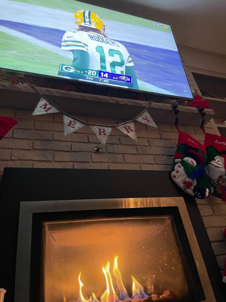 We went home and basically passed out in front of the fireplace with the Christmas tree lights on. The Packers played at 3 pm so I half watched/ half dozed during the whole game.