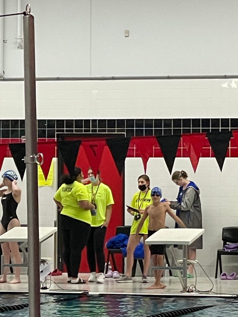 Asher gearing up to swim the 200 yard butterfly! Stretching those arms….he was going to need them… for a looooong time. 😉