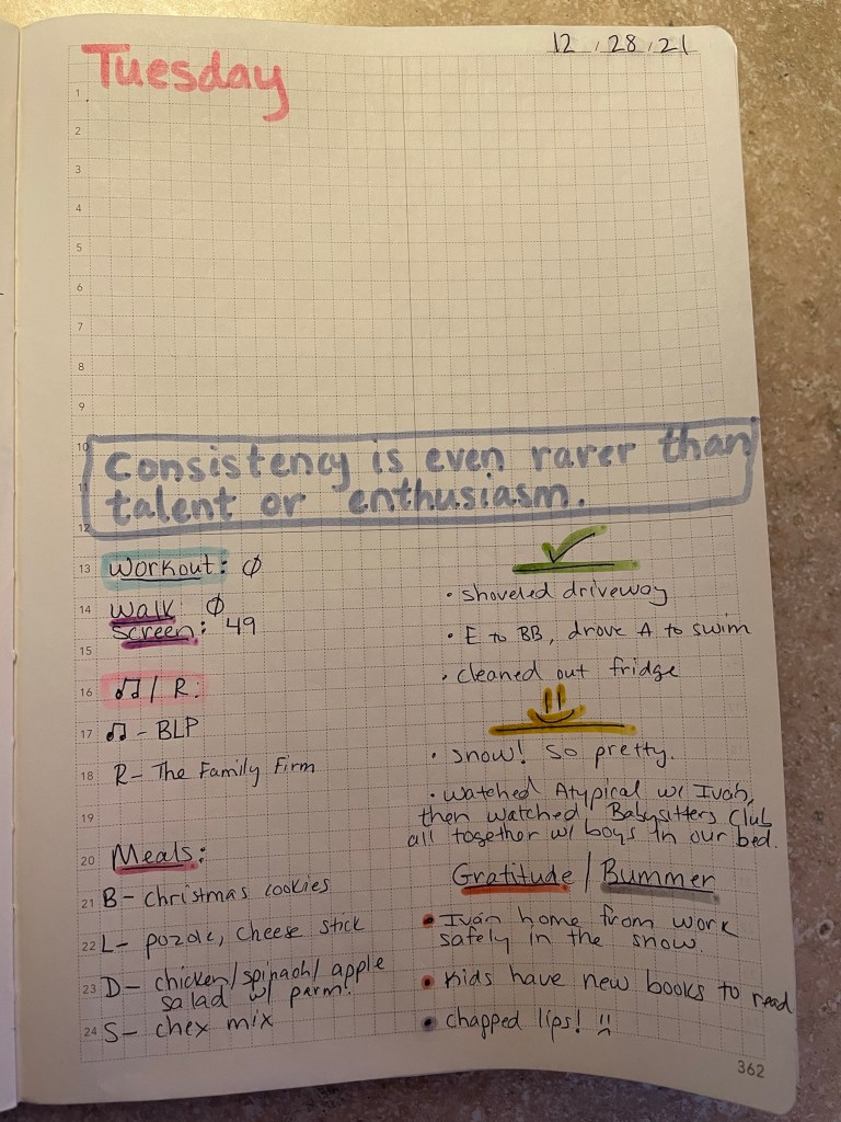 Bottom half I write in bullet points: Workout, Walk (Y or N), Screen time (mostly just social media minutes 😬), Books/podcast listened to, brief summary of my meals, things I “accomplished” that day, things that made me happy that day, and then my Gratitude/ Bummer section.