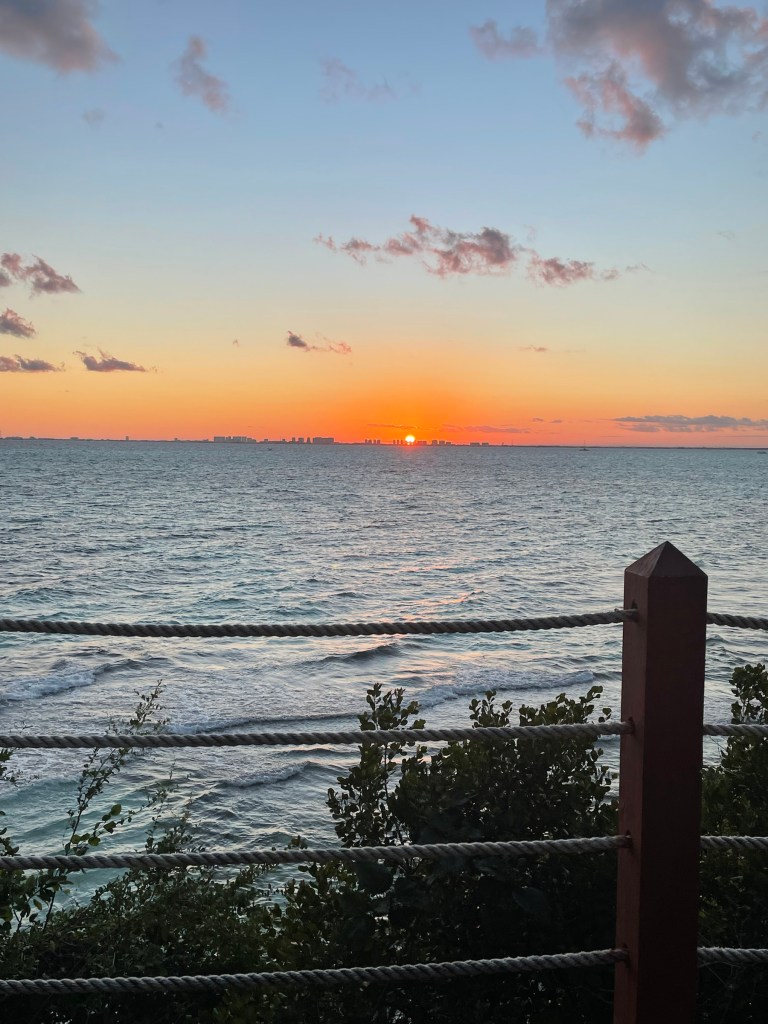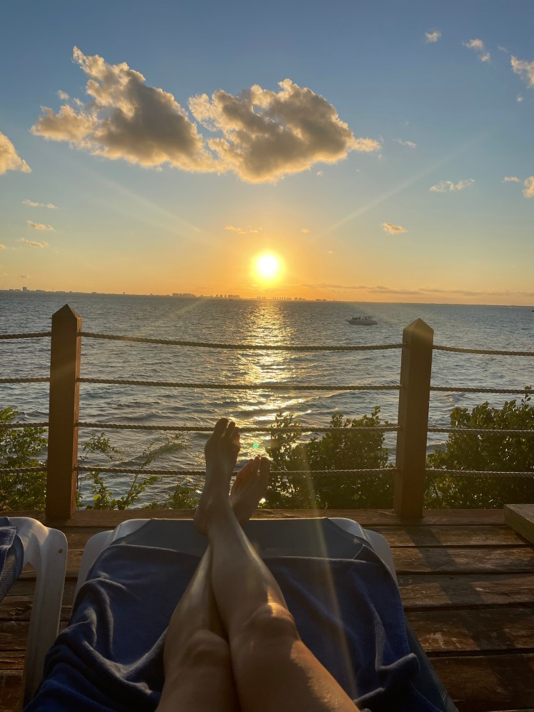 We stayed down there until sunset. Since the hotel faces west, there are great sunsets here. The mainland/ Cancun is across the way, so the sun actually does drop down behind the skyline of Cancun, not into the ocean. But it’s still very, very pretty.