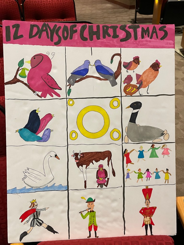 - One of Asher’s pieces was Billy Joel’s Piano Man, an obvious crowd favorite. 😉 His other piece was 12 Days of Christmas (yes, Christmas is over, but he just really liked that one.) His teacher knew he likes art a lot, so she asked him to create a visual to accompany his piece. He drew each of these by hand himself!