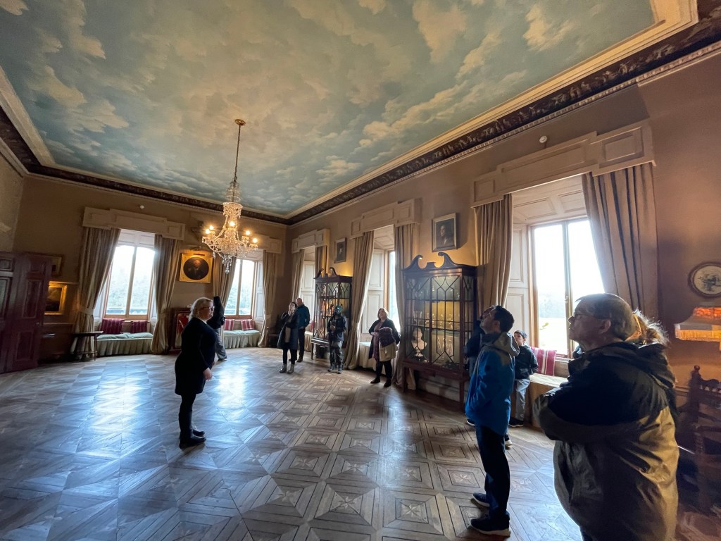 The “drawing room” where the women would withdraw to after dinner. Doesn’t everyone have clouds painted on their ceiling?