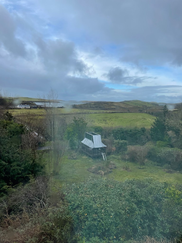 Peeking out my window in the morning- overcast/rain sprinkles but not too bad. (That little building is my nieces’ treehouse!)