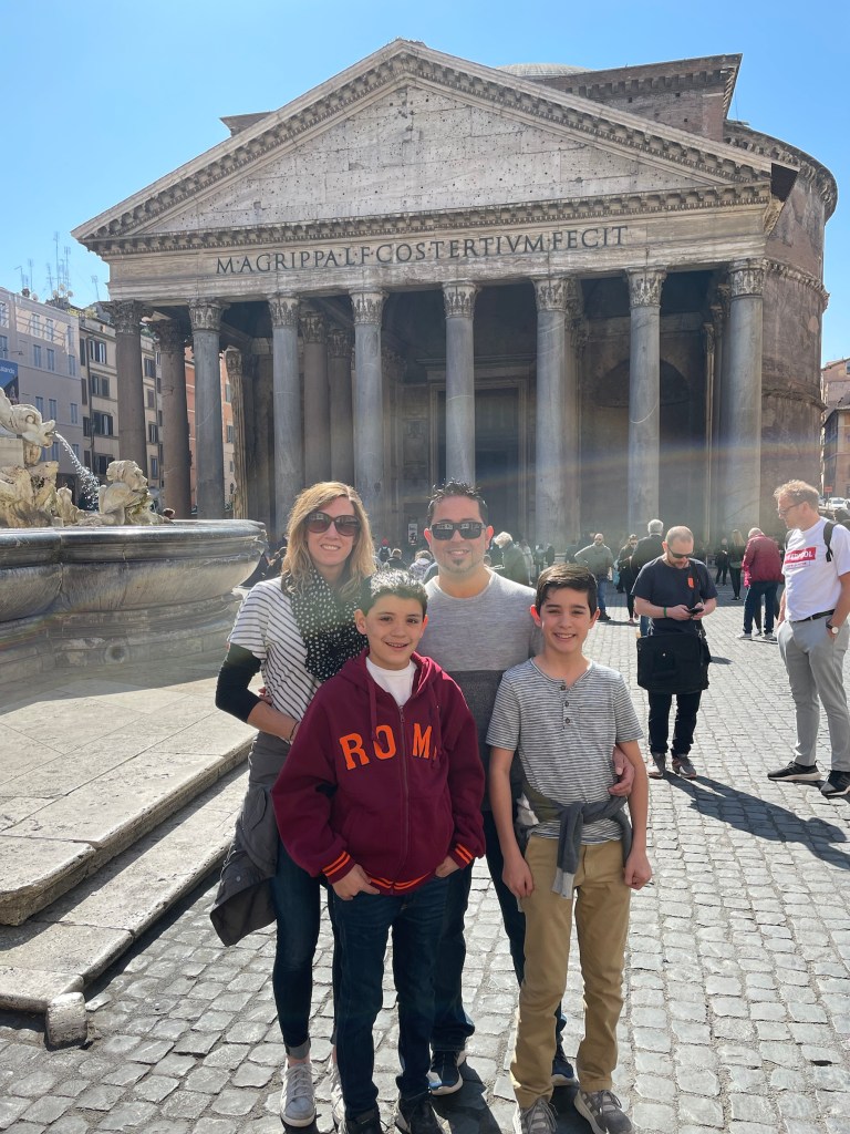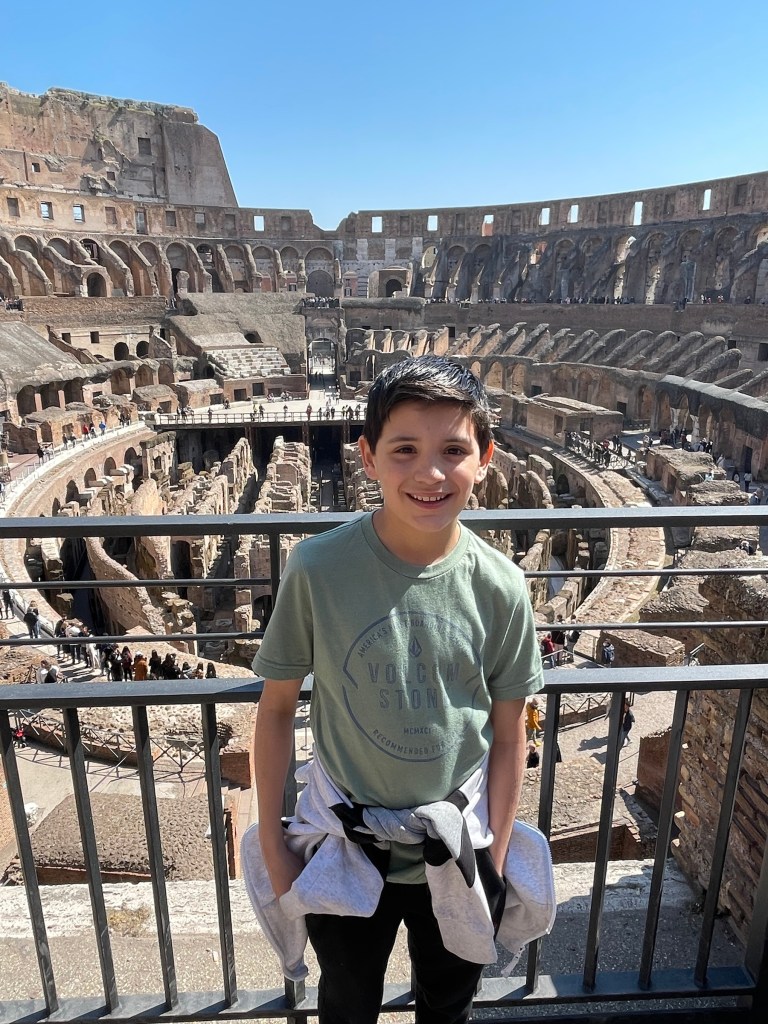 I cannot believe that our 2 week trip is already ending soon. Rome has been absolutely insanely incredible- the boys are obsessed. They looooooove it so much!!! And- we have had 3 days of perfectly blue skies, sunshine, 60 degree temperatures and not a single cloud in the sky for our Rome portion. !!!!!!! Talk about luck. I said we need to thank the Sun God or whoever the ancient Romans would have worshipped. 😉