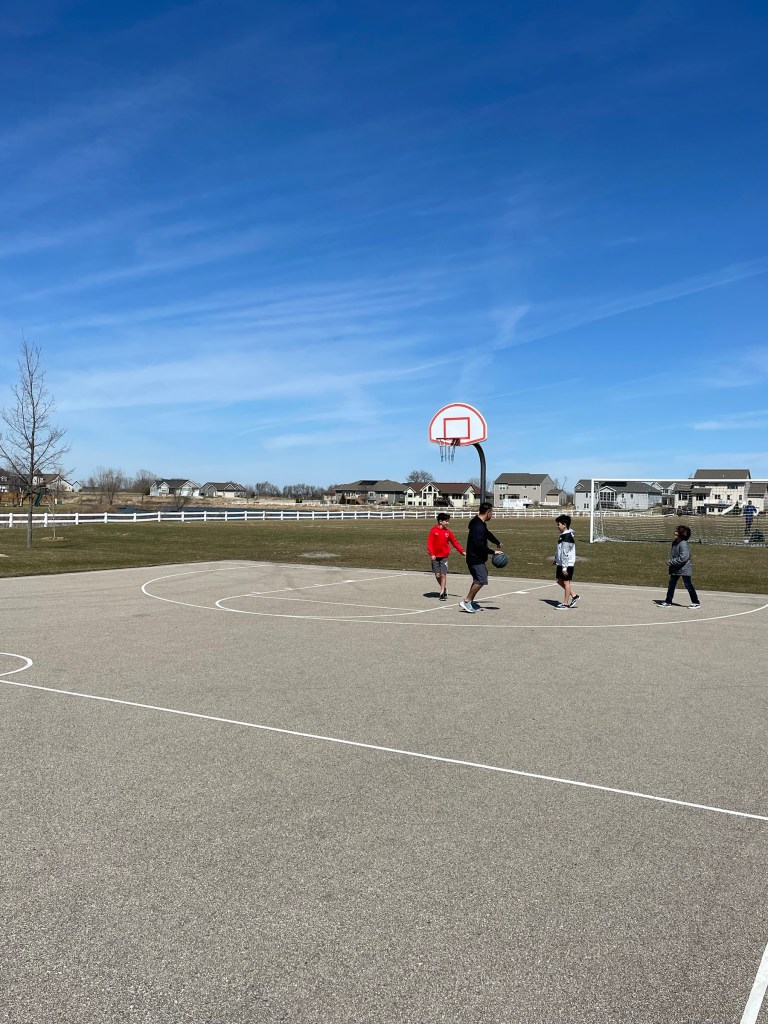 • The weather was pretty mild and sunny, so Ivan and I went for a walk. The boys’ cousin slept over Saturday night after the family birthday dinner, so they were over at the park, too. We met up with them after our walk and Ivan played some 2v2 basketball with them. I just sat and watched. It was nice. 🙂