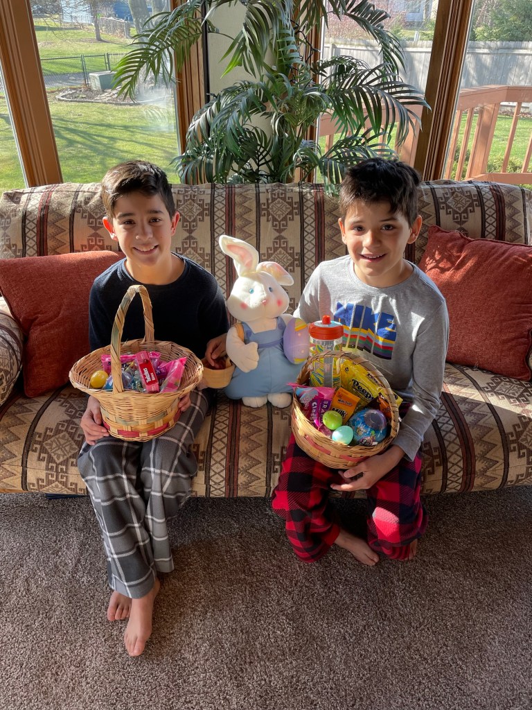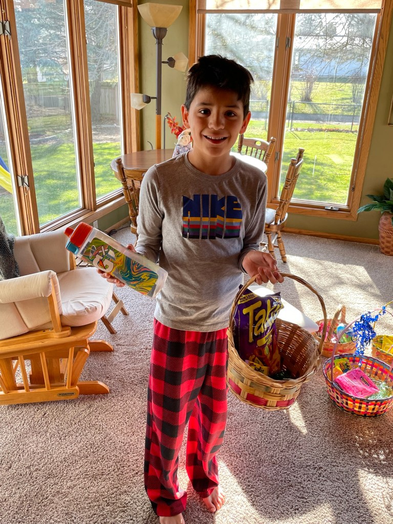 *Easter basket hunt. Mostly just candy, but they each got one “gift” (Ethan a little gym bag, Asher a water bottle).