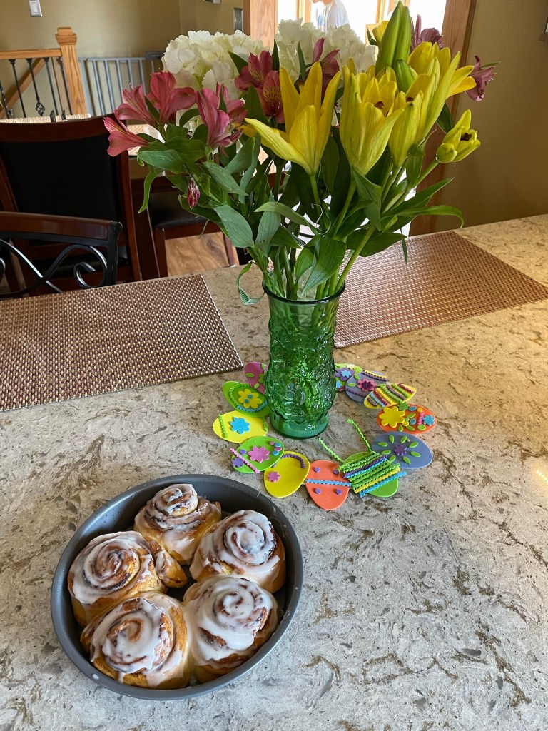 *Breakfast of cinnamon rolls. Not shown, OJ and fresh fruit. These flowers might be my favorite part of the day. I bought them for myself and love them. 🙂