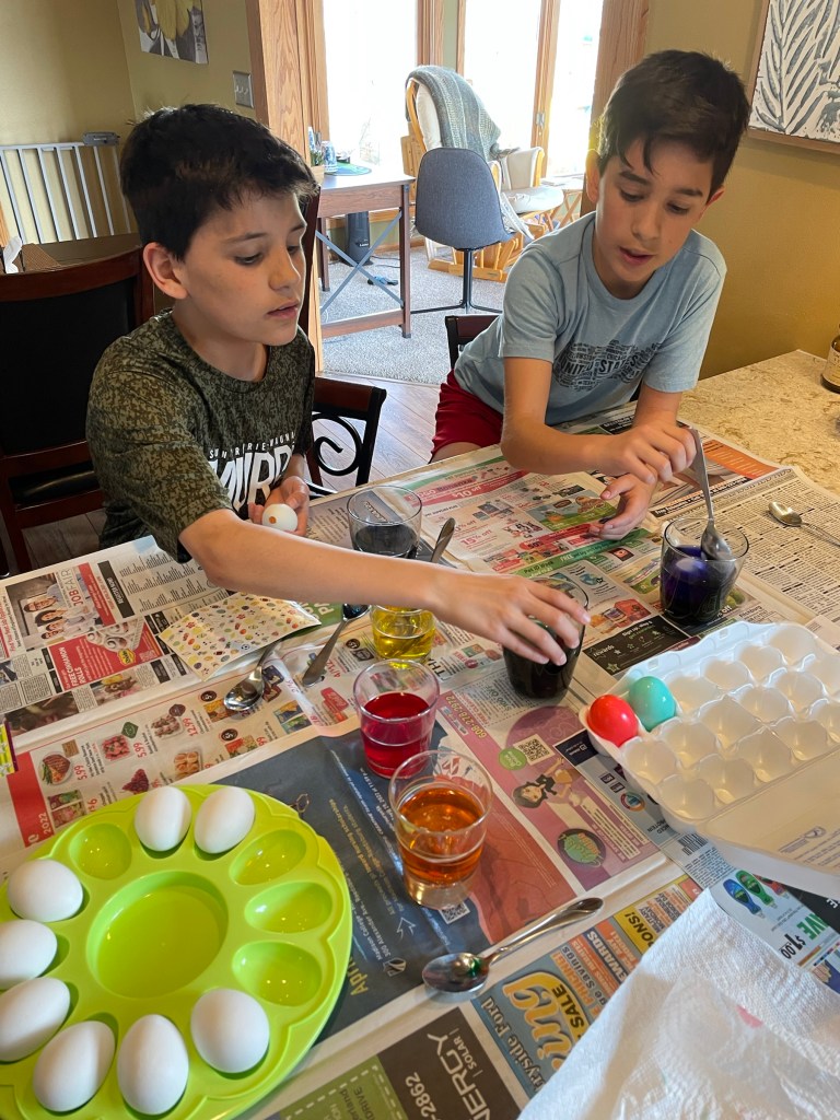 I completely understand the “meh” feeling, but it sounds like the boys were VERY happy and that, honestly, you could plan to do even less next year. Skip the ham, skip the dying eggs?
