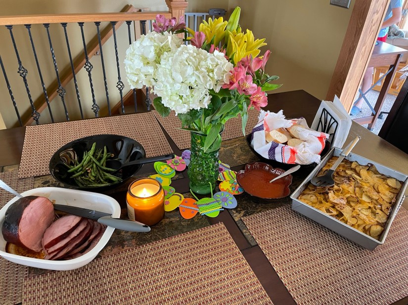The boys liked the Easter baskets, of course, and I guess they like dying the eggs (though I think if we didn’t do this anymore, they wouldn’t complain, either). No one seemed to care much if we actually ate a “fancy” meal at the table. Which kind of sucks when you were the one making said meal. And none of us really love ham. HA.