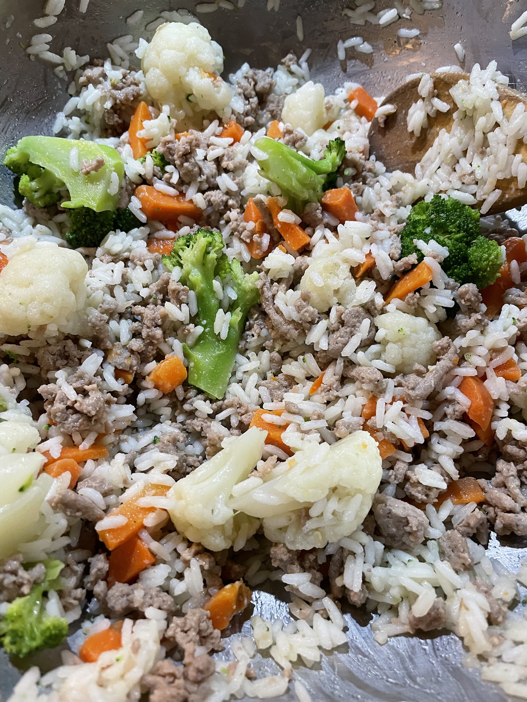 *turkey/veggies/rice all mixed together, like a one pan meal