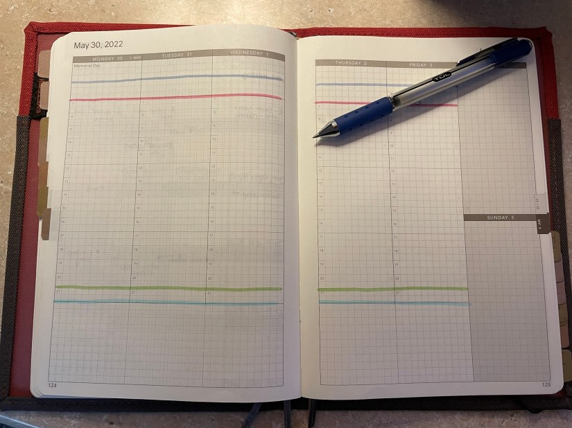 I’ll share some more details later. For now, I’m sitting at my desk looking at my spread for the week: