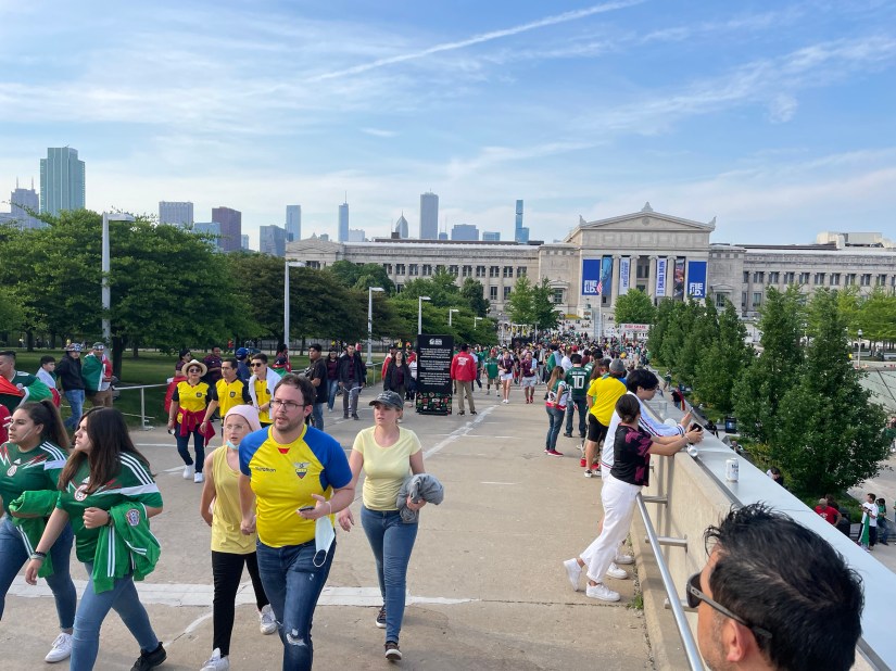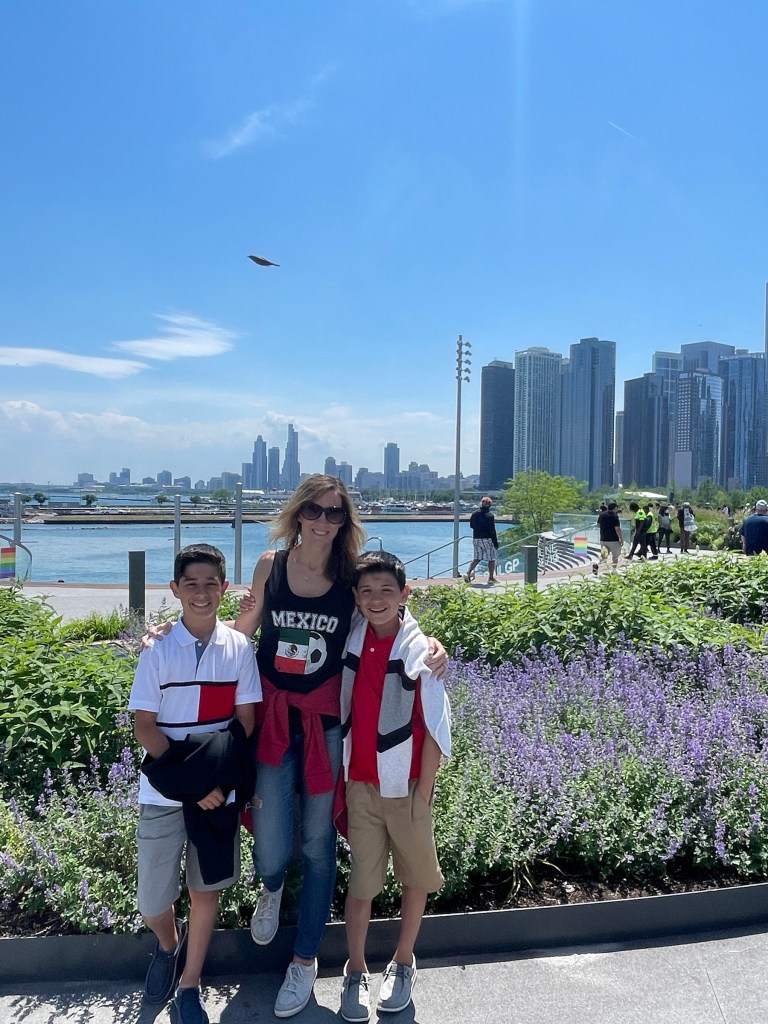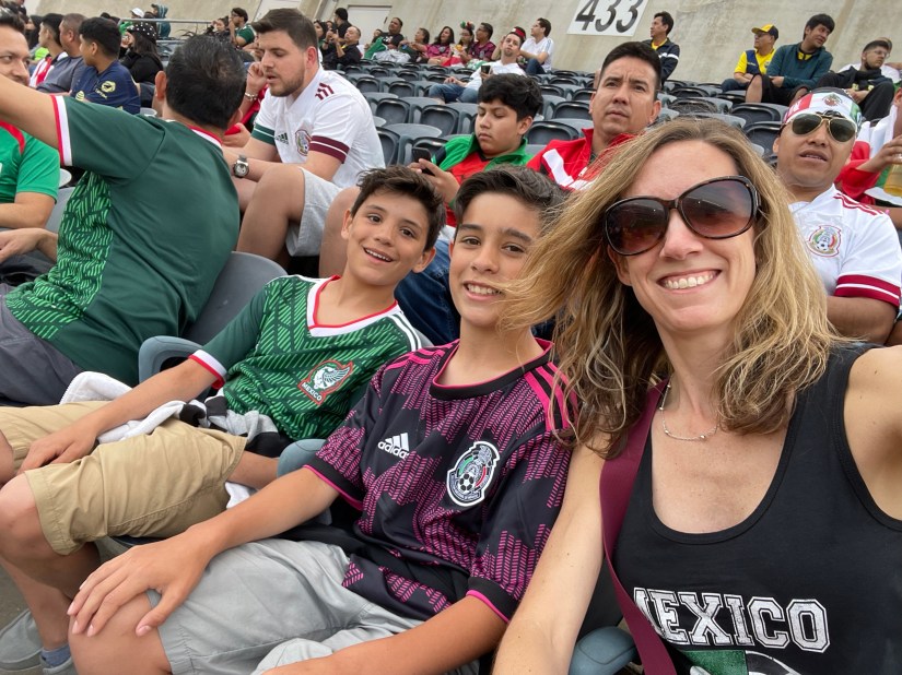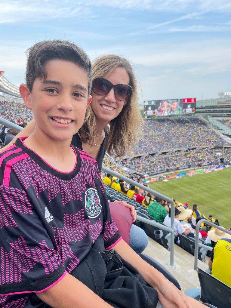 With only minimal complaining, we made it back to the Soldier Field area and joined the masses of people in Mexico gear (or fewer, but still many- yellow Ecuador gear). The atmosphere was CRAZY!! LOUD, music, people drumming and hooting and hollering….super fun! We stopped to buy Mexico soccer jerseys from people selling them along the way for the boys, and Ivan needed a new one too.